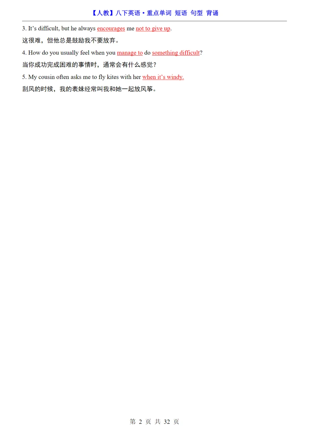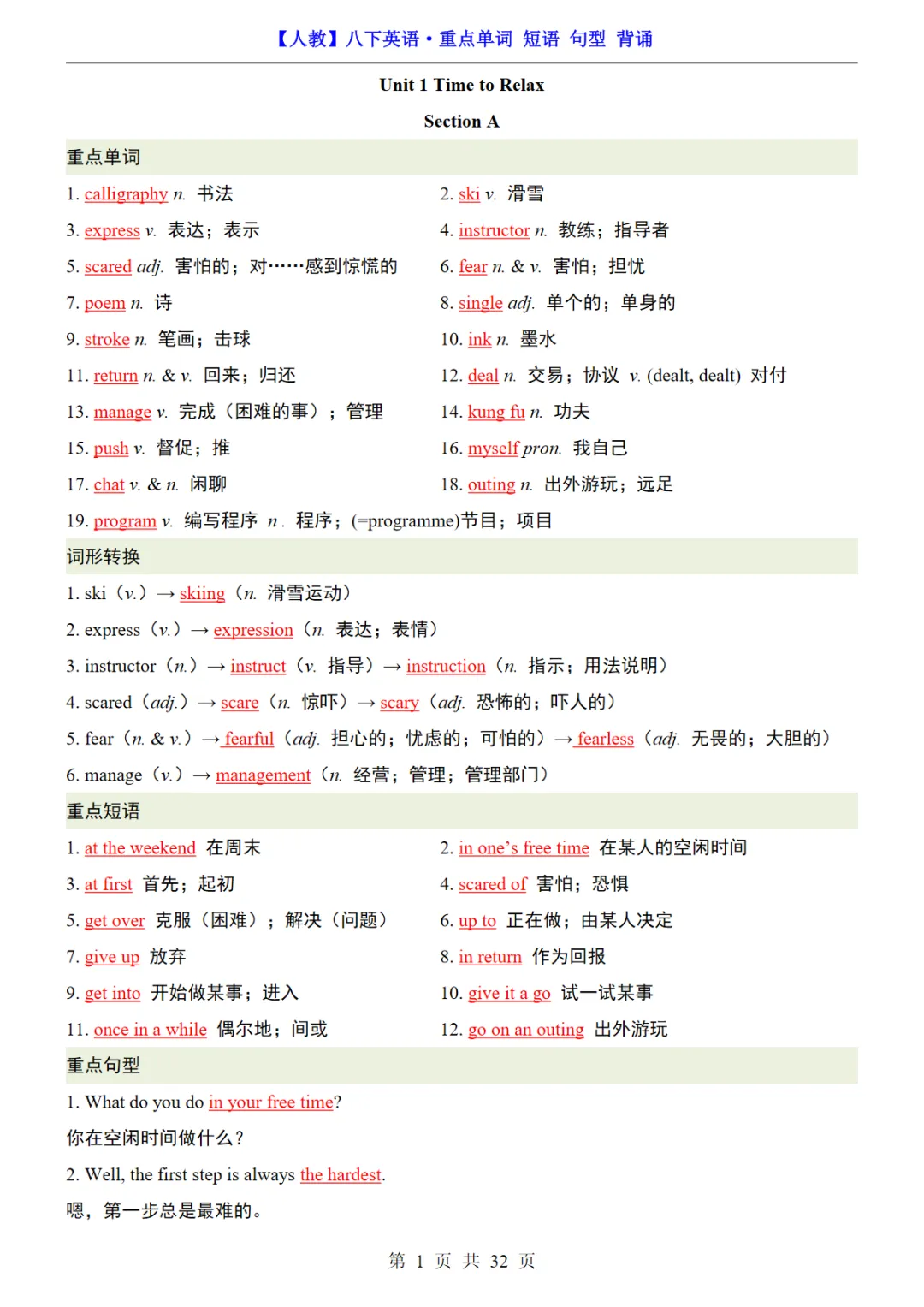 八年级(下)英语 26春重点单词短语句型知识汇总《人教版》