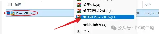 1.解压安装包:鼠标右击【Visio 2016】压缩包,选择电脑上安装的解压软件,点击【Visio 2016】。
