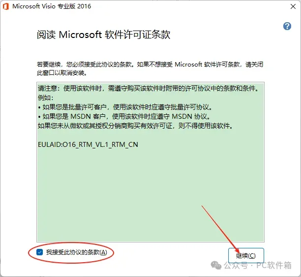 4.勾选【我接受此协议的条款】,点击【继续】。