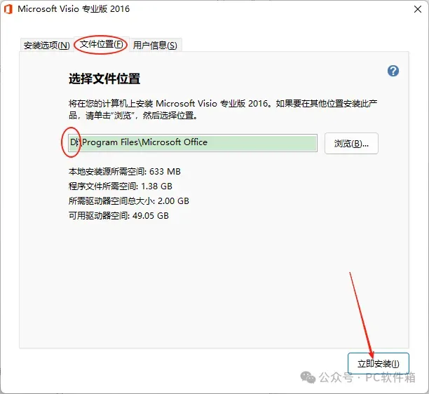 6.点击【文件位置】,修改路径地址中的首字符C可修改安装位置(建议安装到除C盘以外的磁盘),点击【立即安装】。