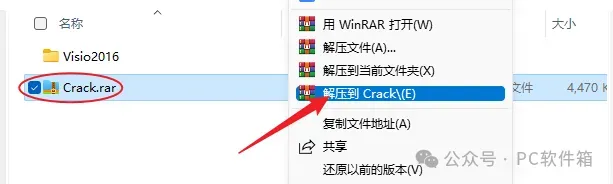 9.打开安装包解压后的【Visio 2016】文件夹,鼠标右击【Crack】选择【解压到当前文件夹】。