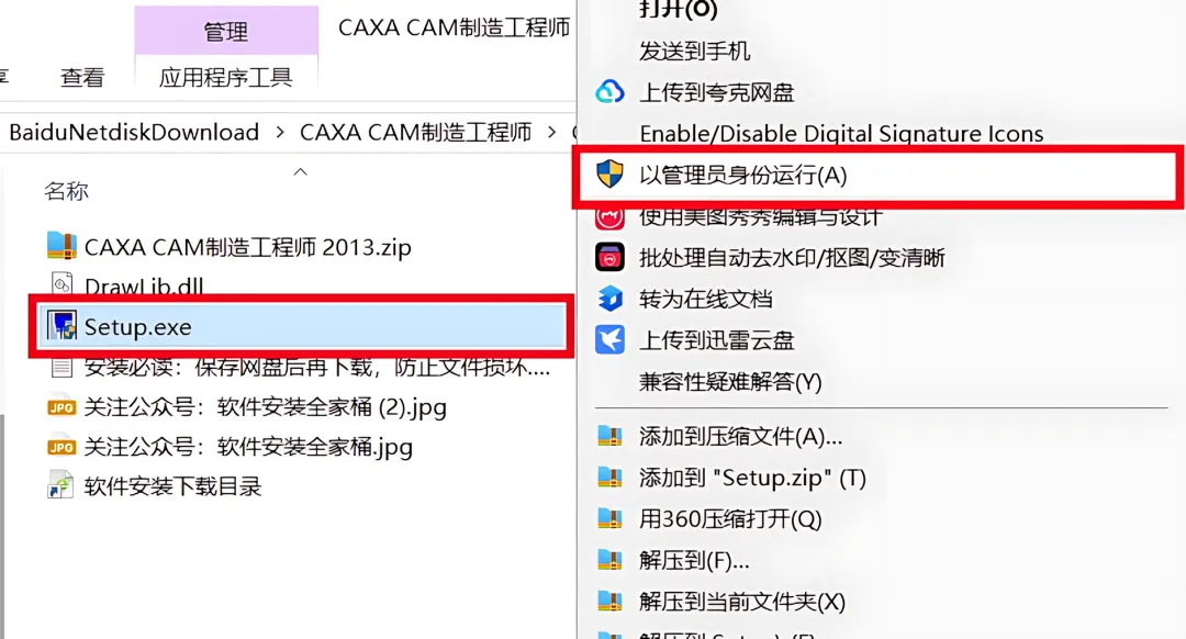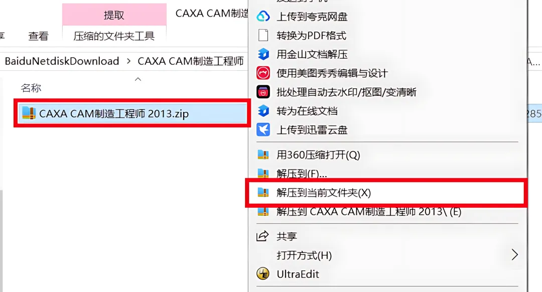 1.下载CAXA CAM制造工程师 2013软件安装包到电脑上,右键选择【解压到当前文件夹】。