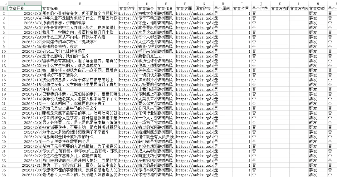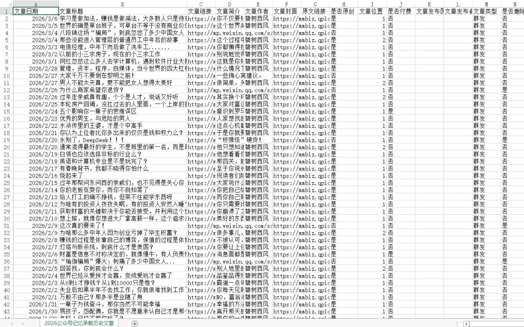 完美搞定,2026批量下载公众号文章内容/话题/视频/音频,导出txt,word,html和pdf,文章标题时间链接阅读数点赞数分享数留言数导出excel
