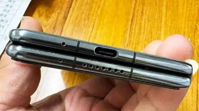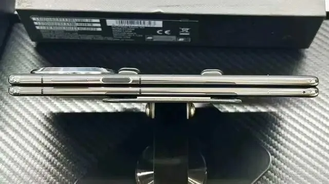 折叠后的直板机。拆包装取真机,小编拿到手的这台MateX3是二手机,使用年代有点长,机身痕迹明显,功能正常。在折叠状态,它像加厚版的直板机,正面是6.4英寸的屏幕,2504*1080分辨率,精度尚可,且正面一样有800w像素的居中挖孔屏设计,自拍与视频无障碍。屏幕棱角圆润,r角大,单手握持手感一般,差异在于机身厚度达到11.08mm,且圆润的中框叠加后,更加压手,重量达到241克,妥妥的半斤重量。