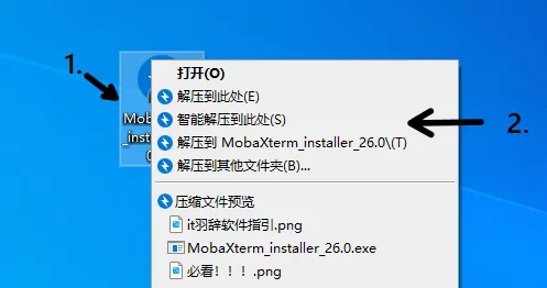 1.点击MobaXterm压缩包,2.右键解压