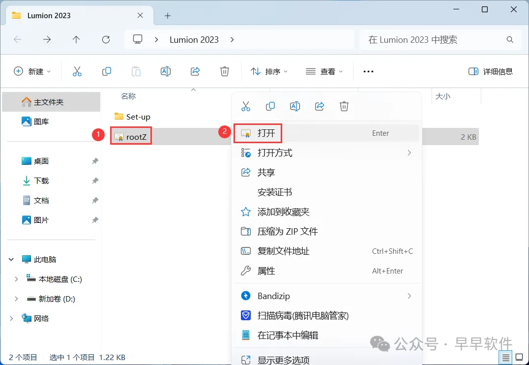 7、回到Lumion 2023文件夹,找到【rootZ】应用程序,右键选择【以管理员身份运行】它