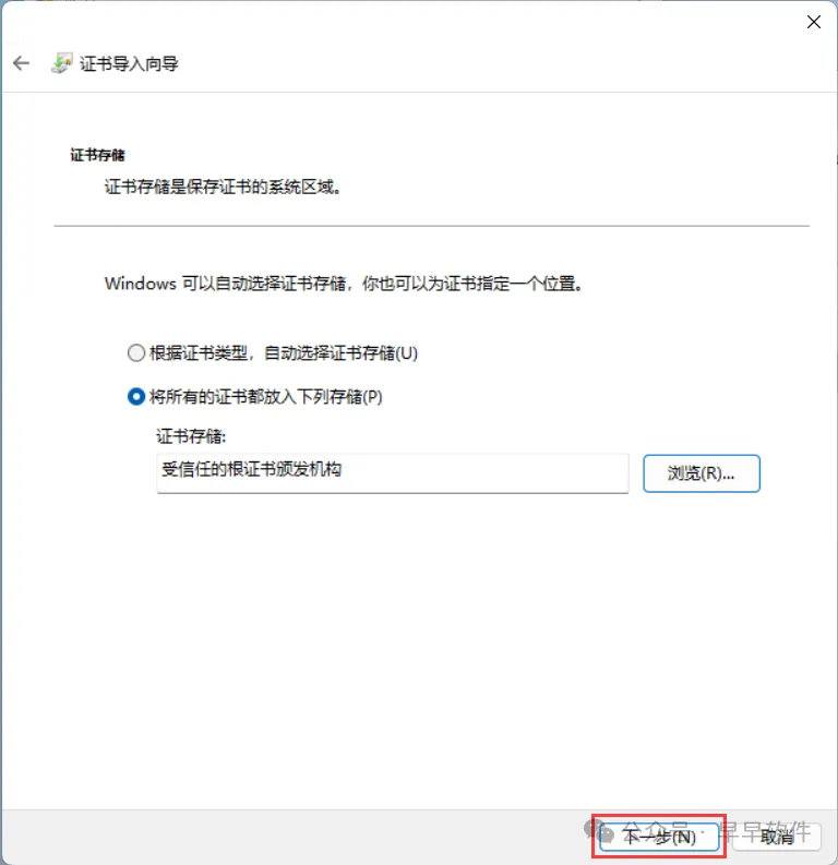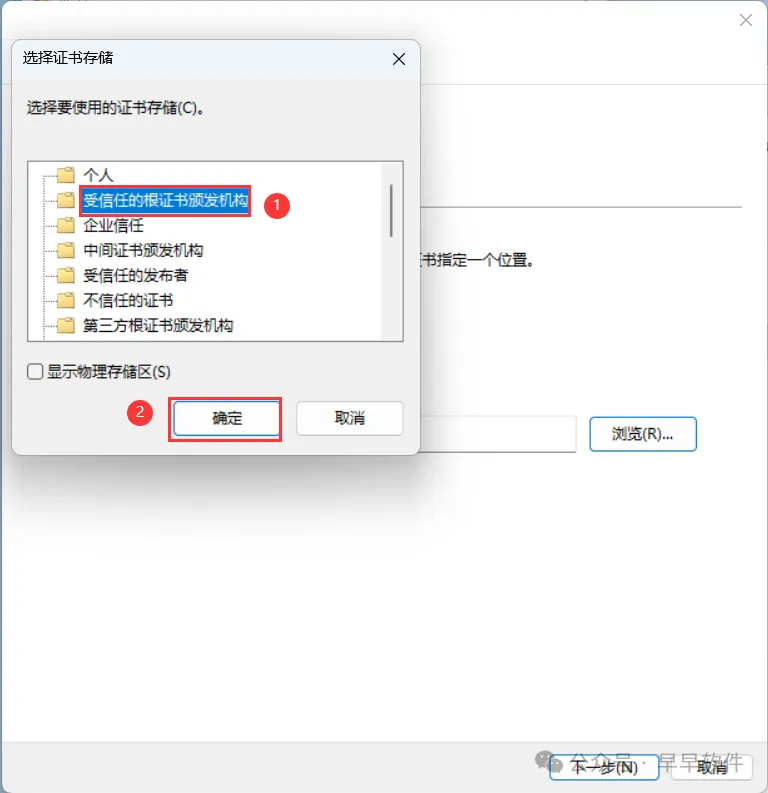 11、选择【受信任的根证书颁发机构】,再点击【确定】