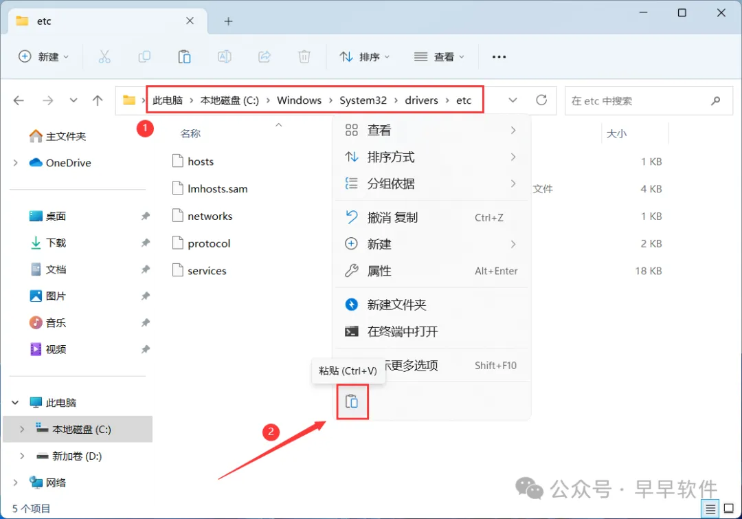 22、回到路径文件夹:C:/Windows/System32/drivers/etc,右键文件夹的空白处,点击【粘贴按钮】