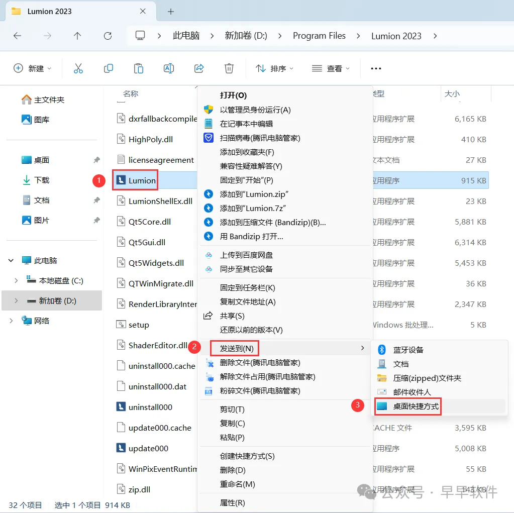 25、打开Lumion软件安装路径,步骤5可查看,找到【Lumion】程序,右键依次点击【显示更多选项】、【发送到】、【桌面快捷方式】,完成软件桌面快捷方式的创建