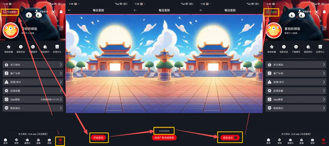 在手机端上点击【我的】,点击左上角的【今日签到】,会打开一个页面,点击底部的【开始签到】,然后等待倒计时结束即可,不要点击广告,倒计时结束后会变成【签到成功】,当日就可以看高清4K了。