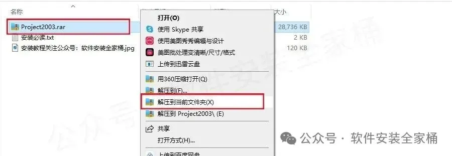1. 打开下载的project2003安装包,鼠标右击软件压缩包,选择【解压到当前文件夹】。