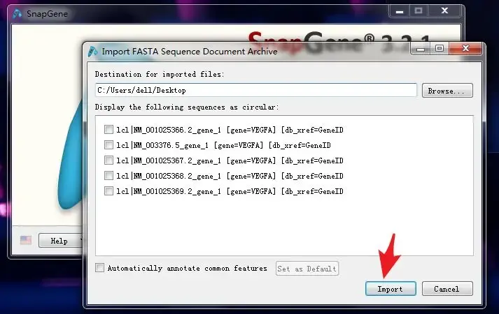 2 SnapGene将自动识别txt中的每个序列,并将其拆分成为单独的序列文件,点击“Import”,软件将生成一个文件夹,文件夹中含有txt中的每一个FASTA序列。
