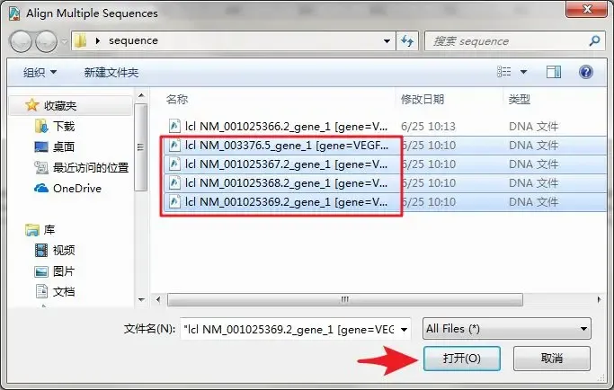 4. 在弹出的窗口中,将剩下几个序列都选中,点击“打开”,SnapGene将对选中的序列进行多重比对: