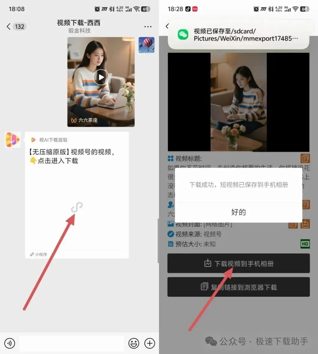视频下载机器人会自动解析视频,几秒后返回下载小程序链接 点击进入小程序点击【下载】按钮视频自动保存到手机相册啦