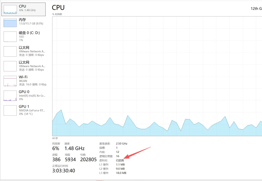 打开任务管理器 → 点「性能」→ 看CPU那栏, 找虚拟化,显示「已启用」就OK,一般电脑默认都是开的。