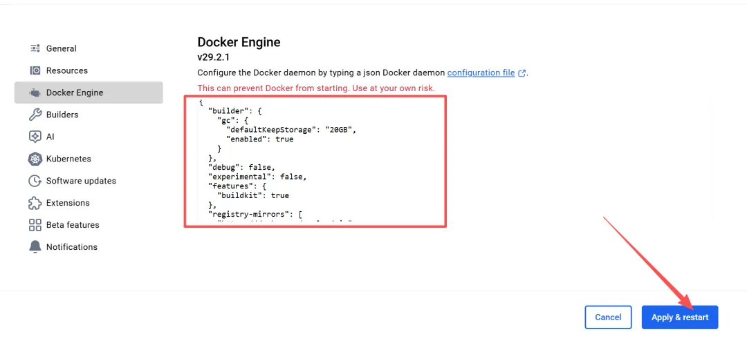 接着打开Docker设置,找到镜像配置, 把这段粘贴进去(格式必须是JSON,别乱改):