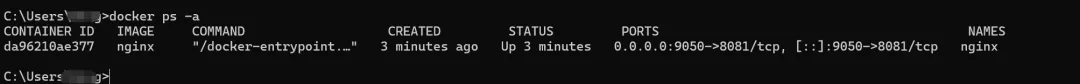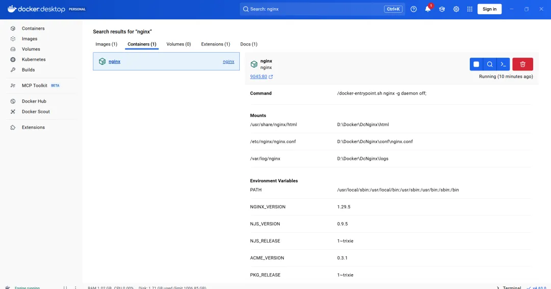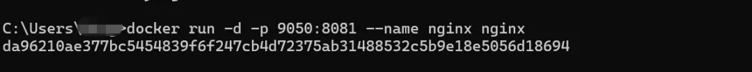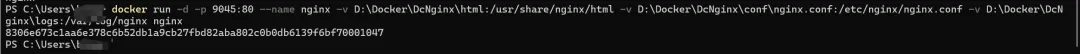 docker run -d -p 9045:80 --name nginx -v D:\Docker\DcNginx\html:/usr/share/nginx/html -v D:\Docker\DcNginx\conf\nginx.conf:/etc/nginx/nginx.conf -v D:\Docker\DcNginx\logs:/var/log/nginx nginx