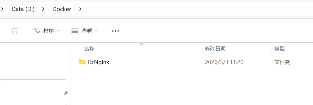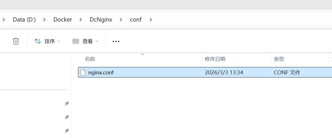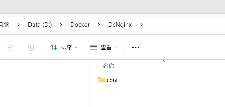 D:\Docker\DcNginx # 路径任意,自己想放在那里就那里D:\Docker\DcNginx\conf\创建完成后,需要在D:\Docker\DcNginx\conf\下创建一个nginx.conf文件
