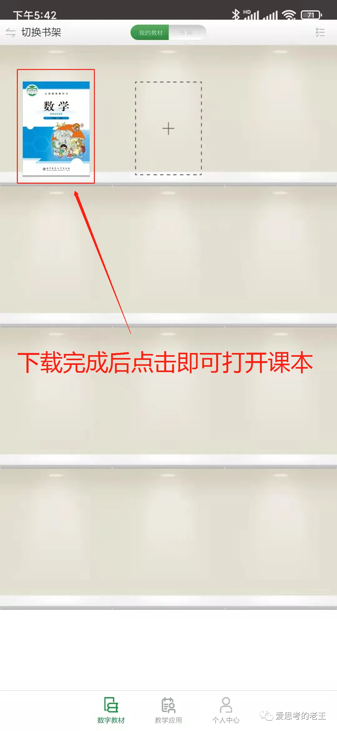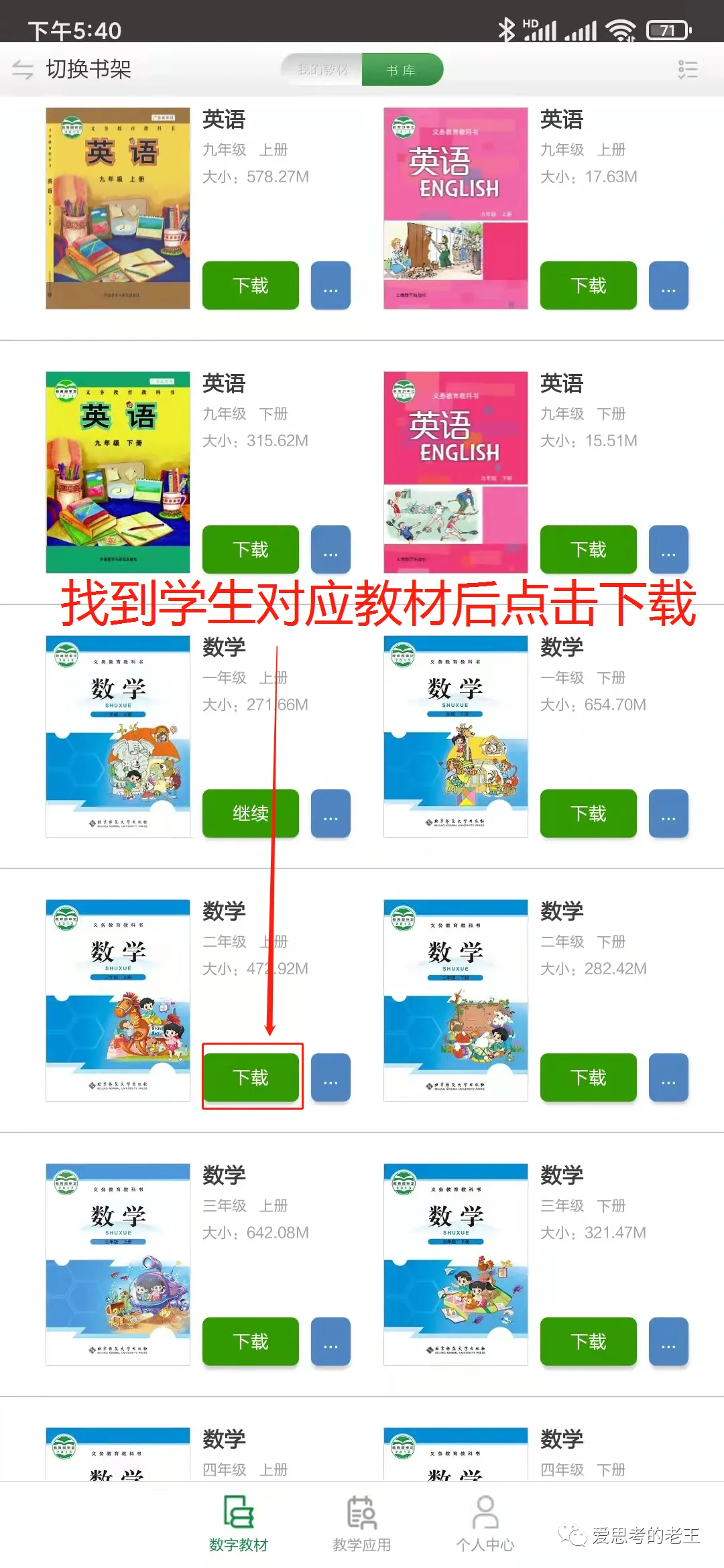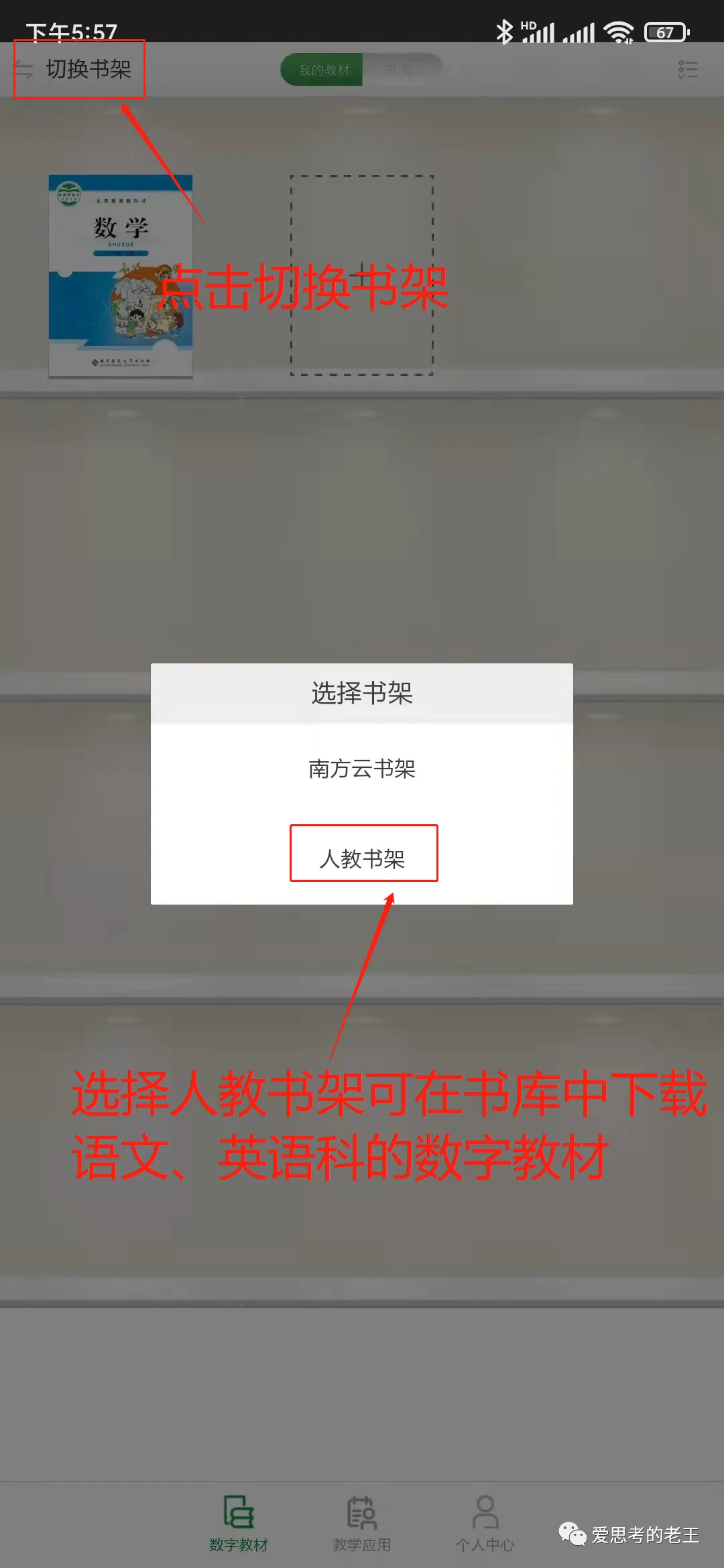 进入APP后有较详细的介绍,请认真阅读后再点击下一页,直至介绍结束后点击“关闭”进入操作界面,在操作界面上点击右上角的“书库”进入数字教材目录,根据学生本身的纸质教材版本下载对应的数字教材(左上角的切换书架可以在南方云书架和人教书架之间切换,我市的数学教材为北京师范大学出版社出版,在南方云书架中可以找到,语文、英语教材为人民教育出版社出版,在人教书架中可以找到,其他科目请自行搜索)[温馨提示:一本教材的体积在400M至1.5G之间,建议在Wifi网络环境下并保证手机至少有3G以上容量再进行下载。]。