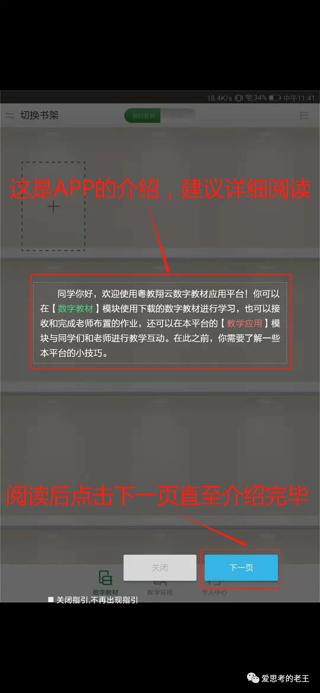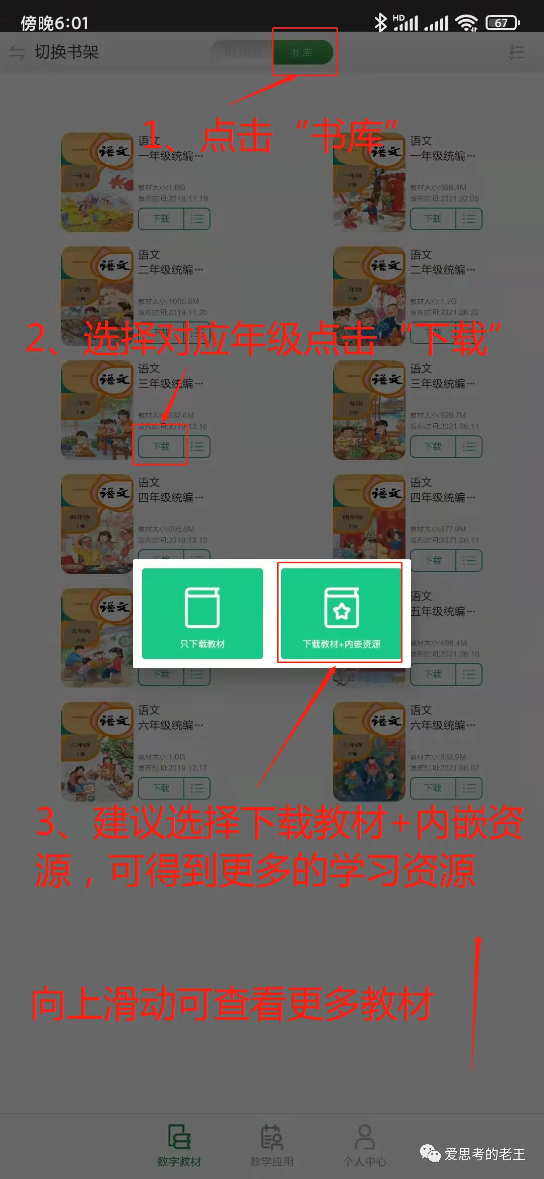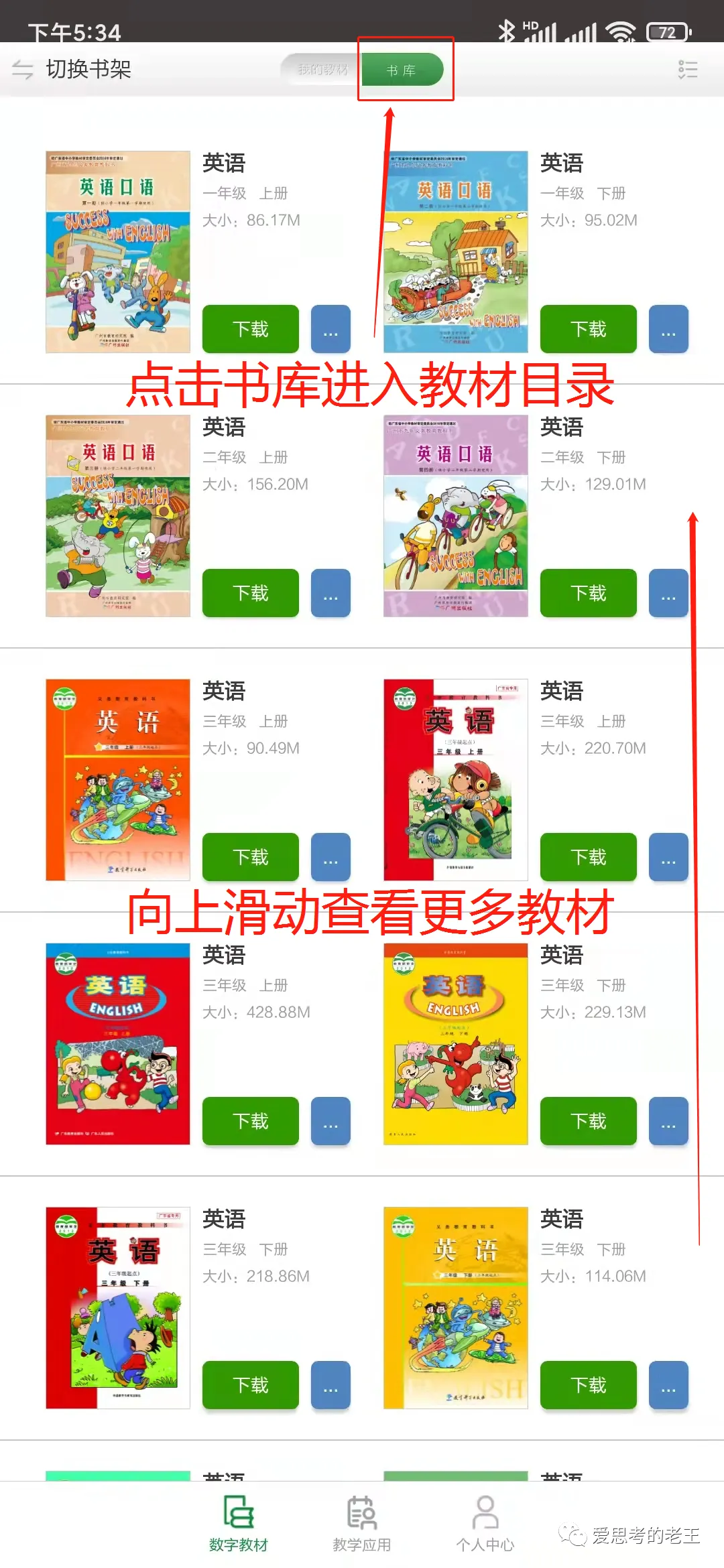 进入APP后有较详细的介绍,请认真阅读后再点击下一页,直至介绍结束后点击“关闭”进入操作界面,在操作界面上点击右上角的“书库”进入数字教材目录,根据学生本身的纸质教材版本下载对应的数字教材(左上角的切换书架可以在南方云书架和人教书架之间切换,我市的数学教材为北京师范大学出版社出版,在南方云书架中可以找到,语文、英语教材为人民教育出版社出版,在人教书架中可以找到,其他科目请自行搜索)[温馨提示:一本教材的体积在400M至1.5G之间,建议在Wifi网络环境下并保证手机至少有3G以上容量再进行下载。]。
