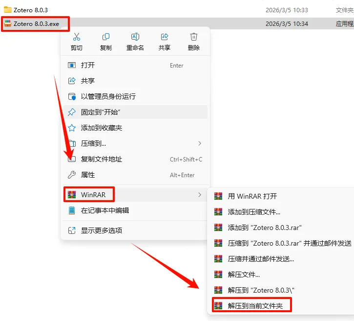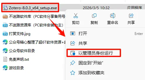 2.打开刚刚解压的文件夹,鼠标右键点击“Zotero-8.0.3_x64_setup.exe”选择“以管理员身份运行”