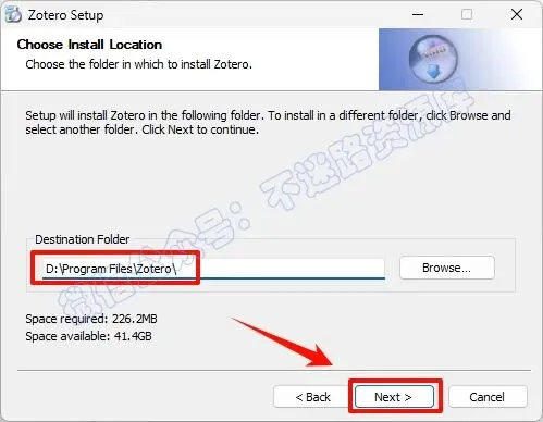5.选择软件安装路径,建议和教程中的保持一致,本例安装到D盘(将路径地址中的首字符C改为D表示安装到D盘,安装路径不要出现中文),点击“Next”