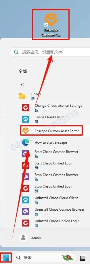 9.点击“开始“菜单栏,点击“所有应用“,找到“Enscape Custom Asset Editor“软件,鼠标左键拖拽到桌面上即可创建桌面快捷方式