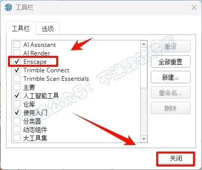 16.勾选“Enscape”选项就会出现Enscape工具栏,点击“关闭”