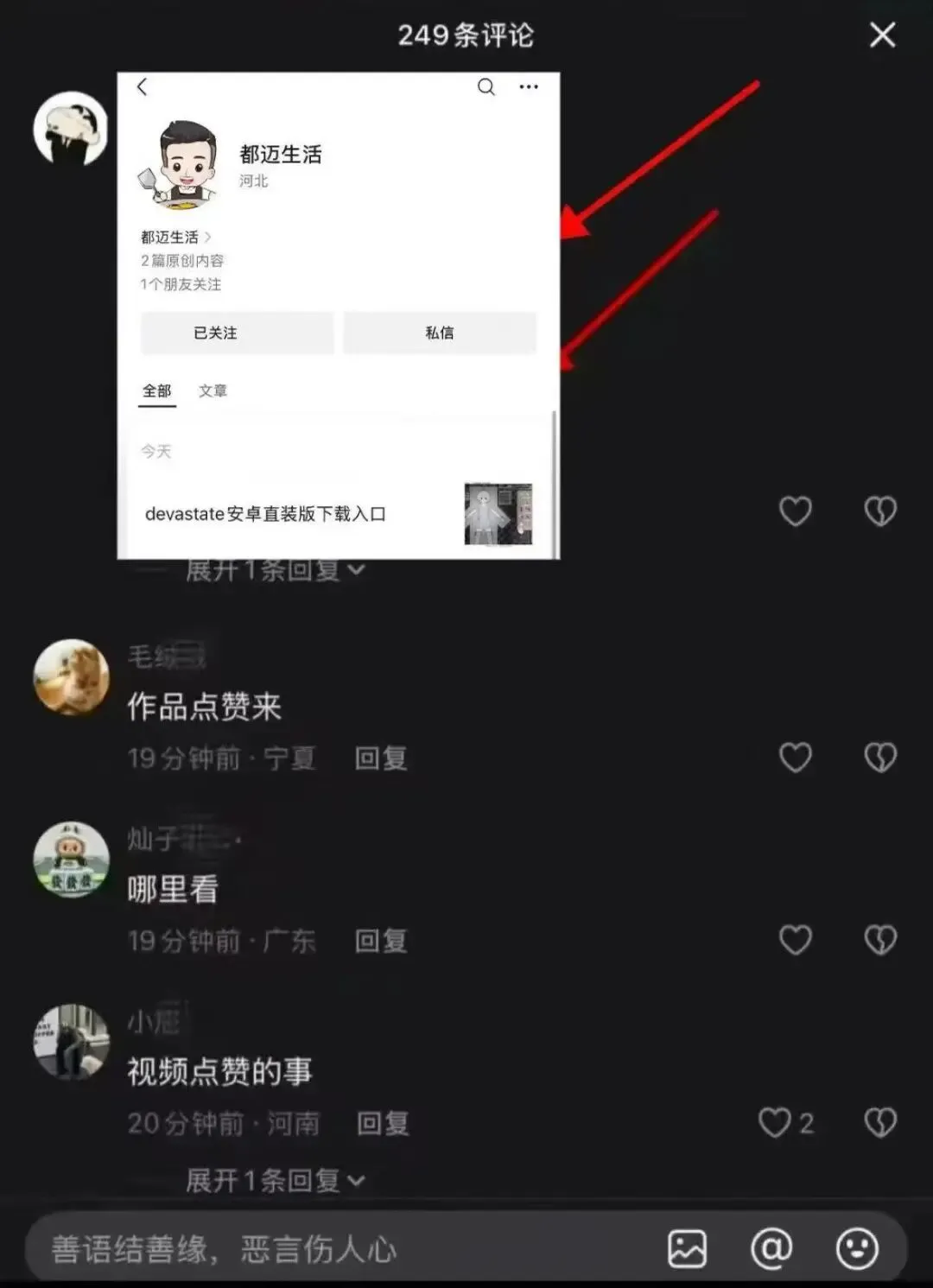 3、搜索后打开前面3个近期比较新日期的作品评论区,评论刚保存的图片,并截图。