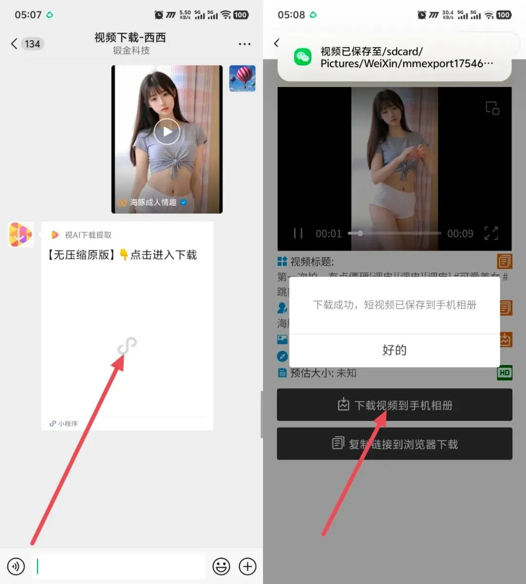 2️⃣ 机器人解析与下载「视频下载机器人」收到视频后,会立即自动解析内容 ➡️ 并快速返回一个专属下载小程序链接 ➡️ 点击进入小程序,即可实现【一键下载】到您的手机相册!从此告别视频号视频下载提取的烦恼!