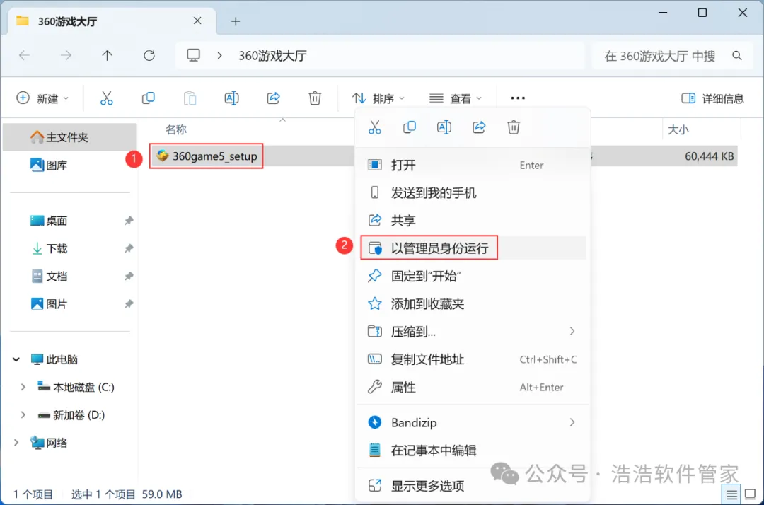 3、找到【360游戏大厅】应用程序,右键选择【以管理员身份运行】它