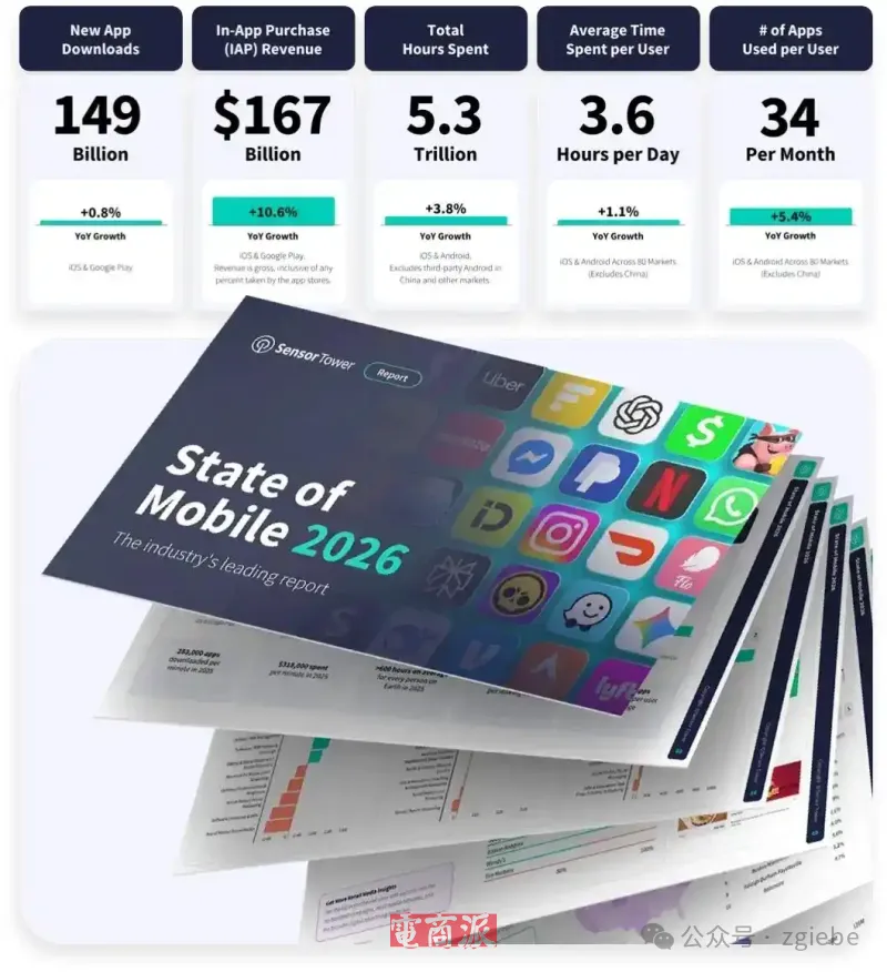 2月27日消息,Sensor Tower近日发布《2026年移动应用市场报告》,对2025年全球移动应用市场进行了系统分析。报告显示,2025年全球移动应用下载量、应用内购买收入和用户使用时长均创下历史新高,AI应用成为推动市场增长的重要力量。