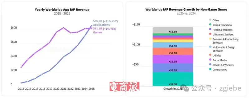 值得注意的是,2025年非游戏类应用的应用内购买收入首次超过游戏类应用。非游戏类应用收入同比增长21%,总额达到游戏类应用的近三倍,相比五年前增长近三倍。相比之下,游戏类应用收入同比增长1.3%,达到接近820亿美元,连续第三年实现增长。
