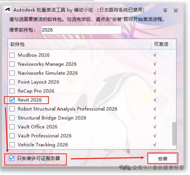 10.选中“Revit2026”,勾选只安装许可证服务器,点击“安装 ”