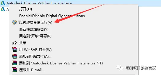 右键以管理员身份运行【Autodesk License Patcher】激活工具。 温馨提示:若没有激活工具或打不开此程序,请关闭电脑杀毒软件和防火墙(Win10及更高系统还需要关闭Defender实时保护)后重新解压安装包