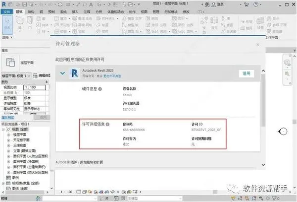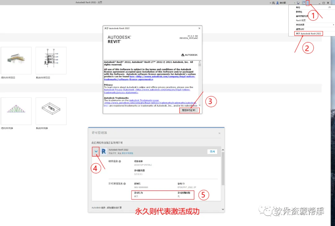 16.进入软件后我们点击右上角的倒三角,点击关于Revit 2022,选择管理许可证,展开证书界面看到许可行为为永久并且到期为无则表示激活成功;