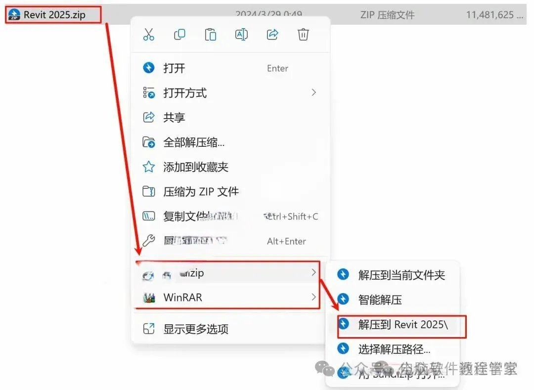 1.将安装包下载到本地电脑后解压缩。选中“Revit2025”鼠标右键解压到“Revit2025 ”文件夹