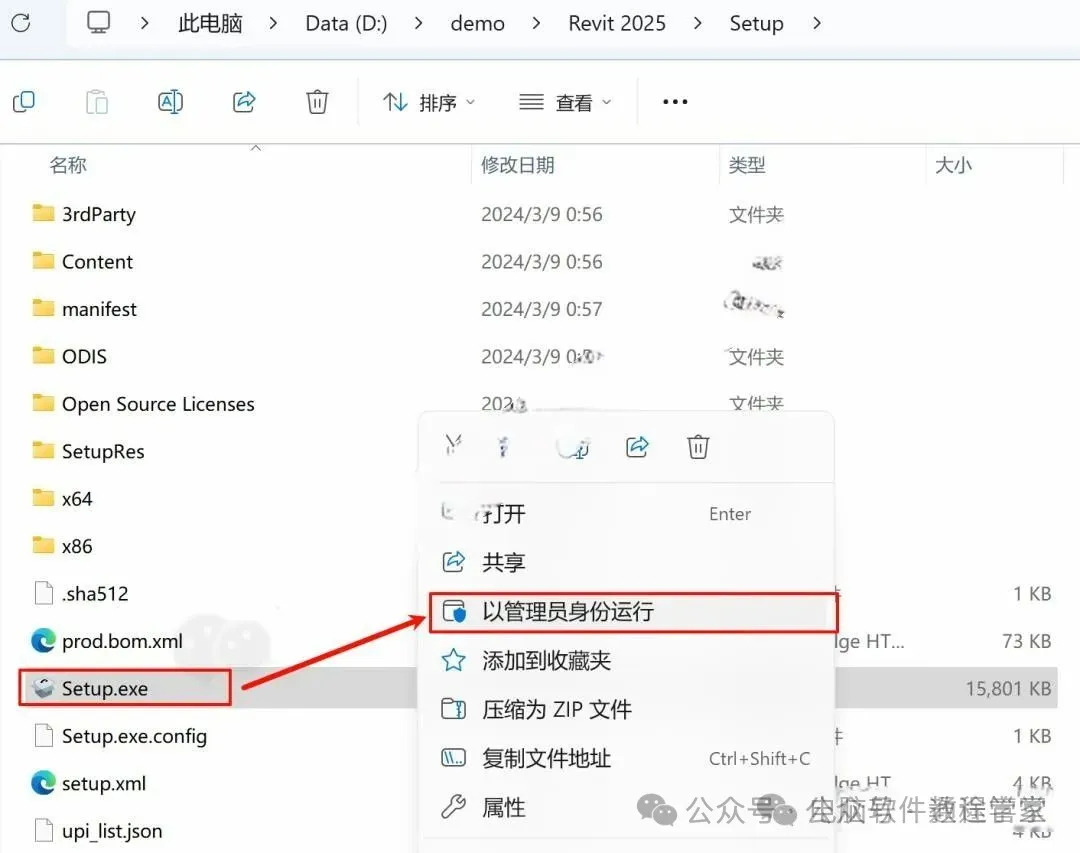 3.选中"Setup.exe"右键选择“以管理员身份运行”