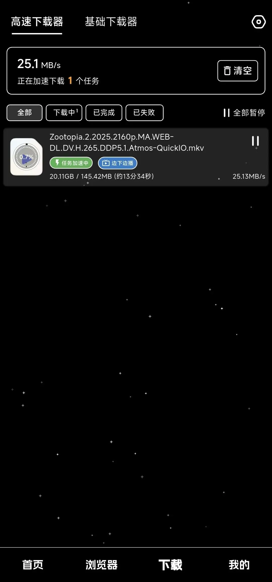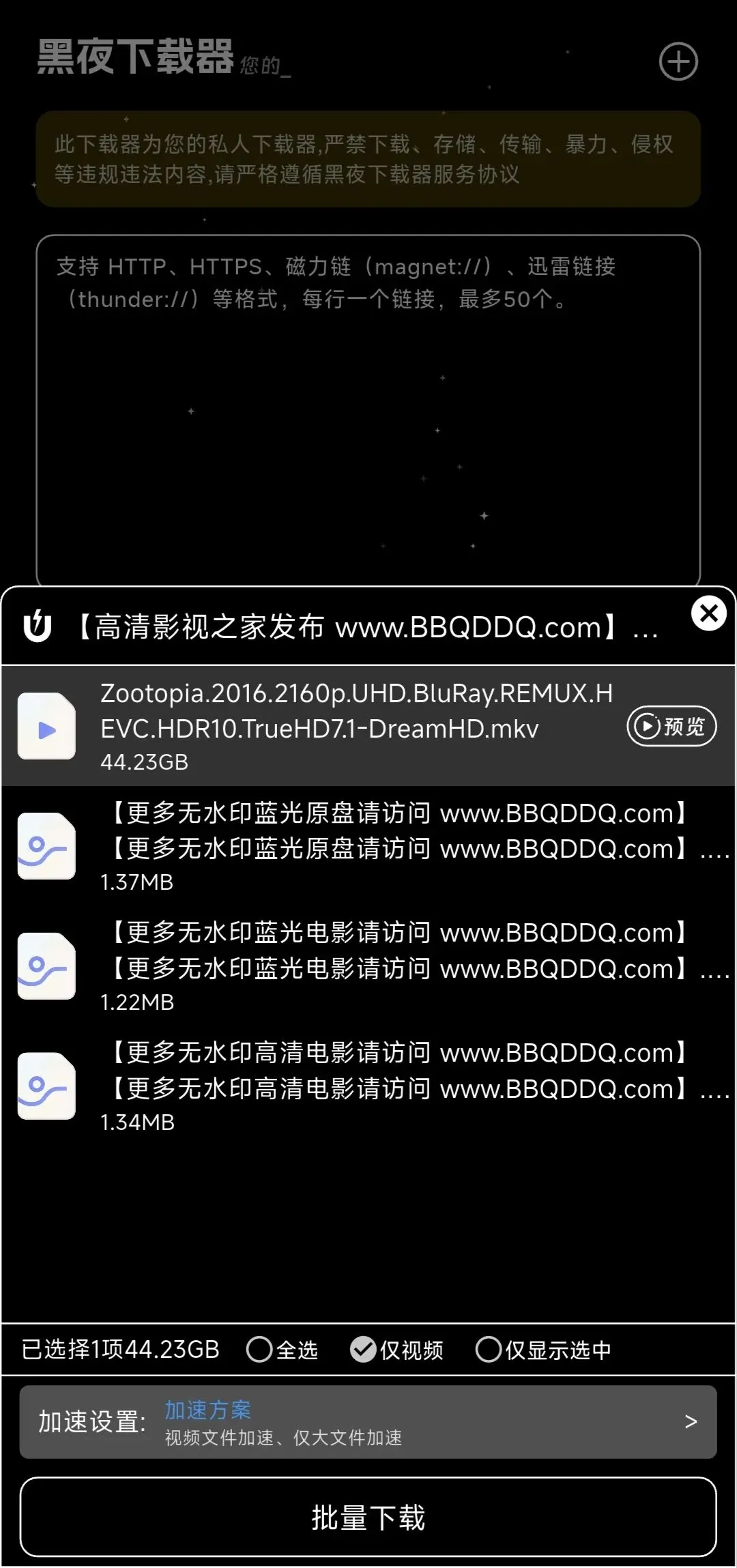 教你怎么下载自己想看的资源,完全免费,拿走即用昨天跟大家分享了夸克网盘的云收藏用法,结果有朋友在后台私信我,说这个功能是需要会员的,如果没开通的话,一个月最多只能用三次。好吧,这个是我考虑不周了,因为我自己一直是会员,所以没有注意到这个限制。那这一期呢,就不分享电影了,给大家推荐一个完全免费、无限制、不用开会员的磁力下载工具。上一期结尾,我已经教过大家怎么获取磁力链接,步骤很简单,这里就不再重复赘述了,感兴趣的朋友可以回去翻看上一期内容。复制好磁力链接之后,打开这款「黑夜下载」软件,一进入首页,系统就会自动弹出识别链接的界面,不用手动粘贴。接下来,选中你想下载的对应电影,直接点击界面上的 “批量下载” 按钮,不用多余操作,一步就能选中所有需要下载的内容。点击 “批量下载” 之后,再点击下方的 “进下载页”,一般来说,做种的人越多,下载速度就越快,热门电影基本能实现高速下载,冷门资源可能会慢一点。电影下载完成后,不用切换其他播放器,直接在这里点击就能播放。想上传到网盘或者保存到其他地方,却不知道本地文件在哪里的话,可以点击右下角”我的“,点击这个“选择存储路径”,就能看到电影保存在本地的具体位置了。PS:这款软件我自己已经用了好几个月,整体使用体验挺顺手的,没有广告,到现在一直都是免费使用,没有任何收费割韭菜的套路,大家可以放心下载。如果你感兴趣的话,可以关注本公众号,在后台聊天框发送关键词【26】,就能获取软件安装包。关注「银幕深一度」,我们下期不见不散。