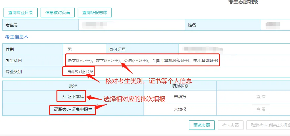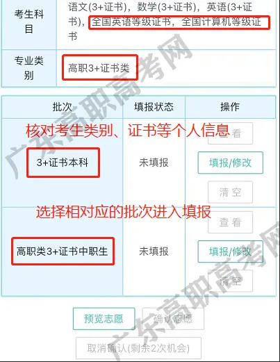 选择【证书志愿填报】,核对相关信息。