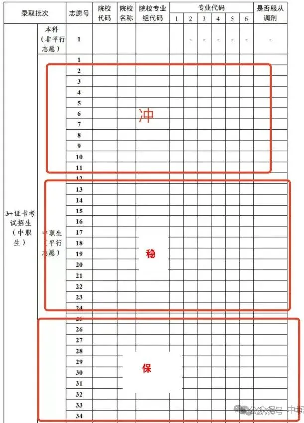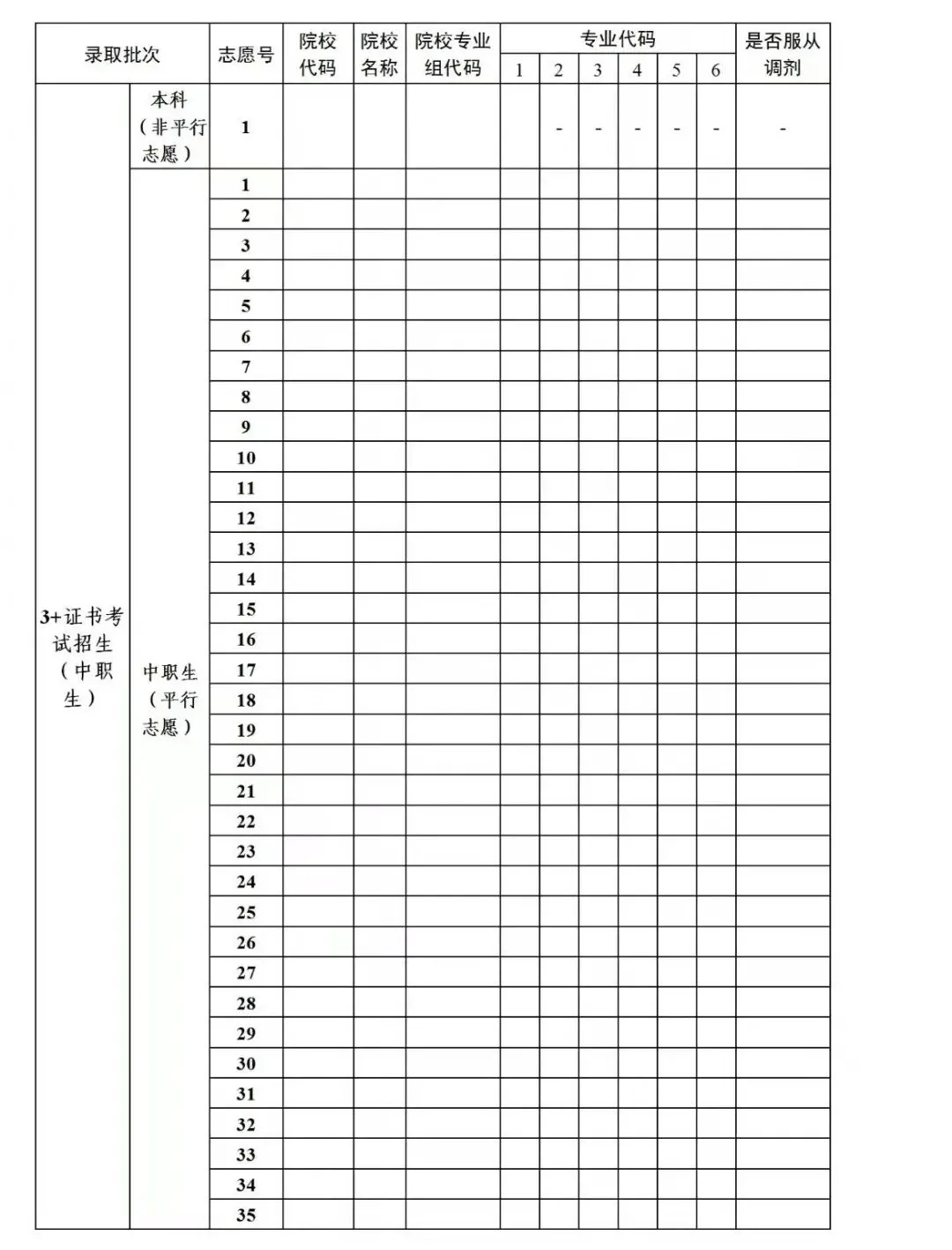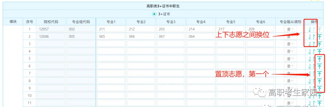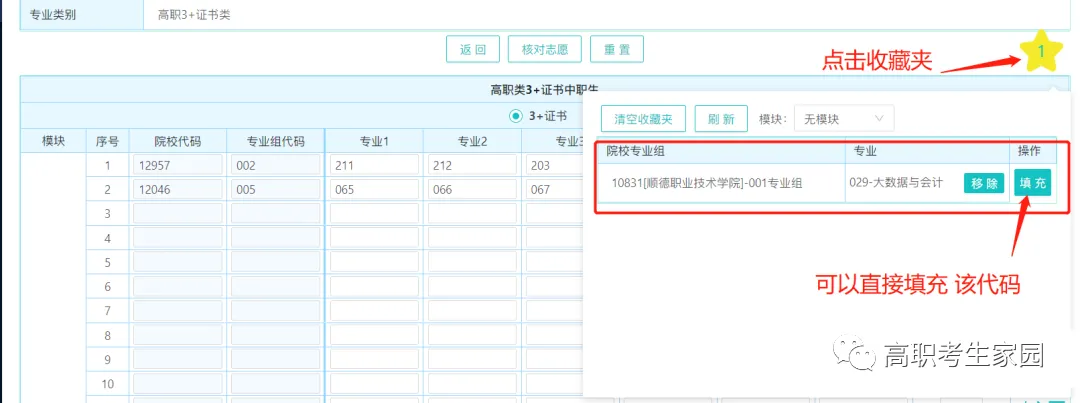 专科组输入院校代码、专业组代码和专业代码填报,一共可以填35个院校专业组,可以不填满。