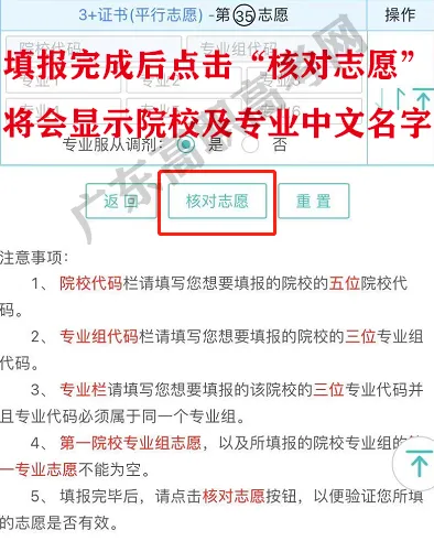 填报完成后点击“核对志愿”,将会显示院校及中文名称。