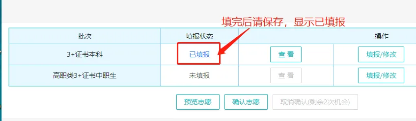 点击保存志愿,填报状态从【未填报】中改为【已填报】。
