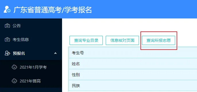 点击首页中的【查询所报志愿】,可以查看自己填报的志愿。