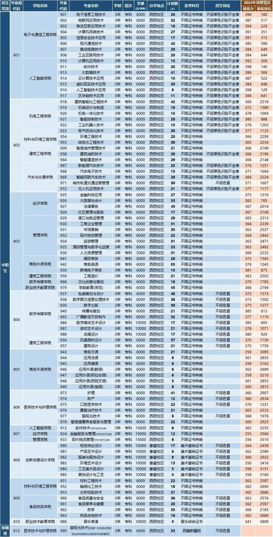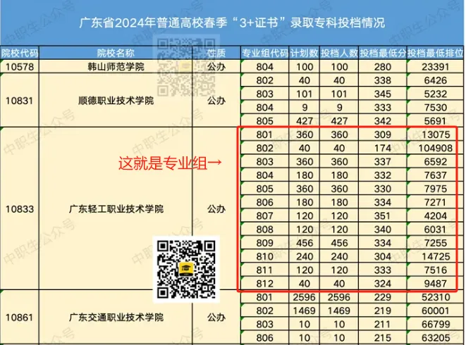 已关注关注重播 分享 赞但是,不同的院校设置专业组的方法也有所差异,有些院校设置多个专业组,有些院校只设置1个专业组。 以深圳职业技术大学为例(请看下方图片),2024年该校3+证书分别设立801、802、803...810一共10个专业组,每个组内分别有不同的专业,一个院校专业组即为一个独立的志愿,服从调剂也只能在同一个组内进行。