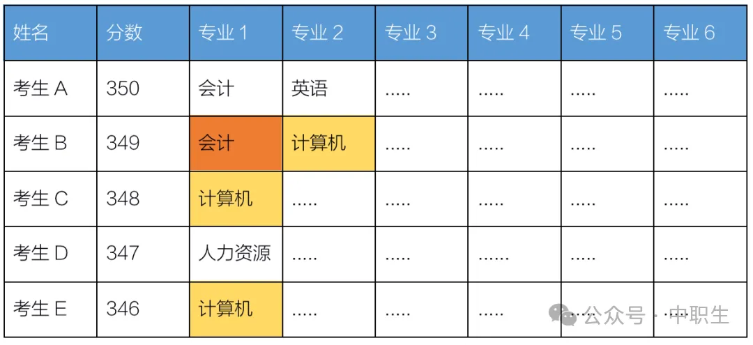 如上图,假如会计专业仅招1人,计算机类专业招2人。在专业优先的录取规则下,考生B第一志愿会计专业未能被录取,而计算机专业优先录取了第一志愿的考生C、E,在第一志愿已招满的情况下,考生B虽然分数更高,但他的第二志愿计算机类专业也失去了录取机会。所以在这种录取模式下,第一专业的选择尤为重要,不可任性乱填,一定要结合自己的排位、招生计划变动情况等多种因素,把适合自己报考的专业给定位出来,争取一击即中。