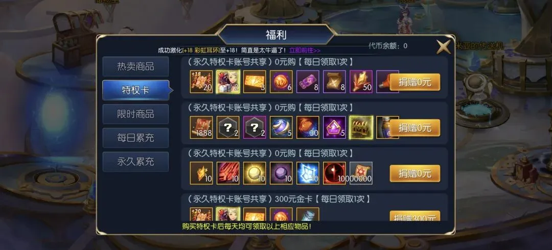 充值中心还可免费领取三张特权卡,让你起号更加快速!