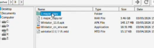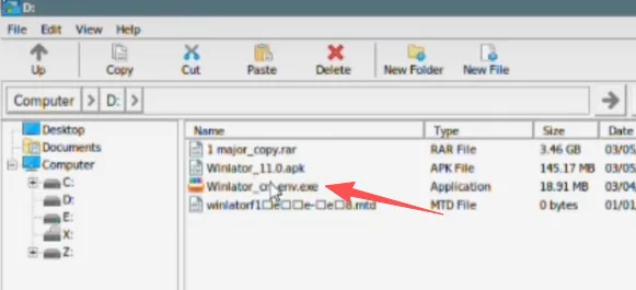 7、启动,点击D盘,运行winlator_cn_env.exe,这会让你的操作界面变成中文,不然你看左下角开始按钮处是不是两个口,这就是系统现在还不是中文造成的。