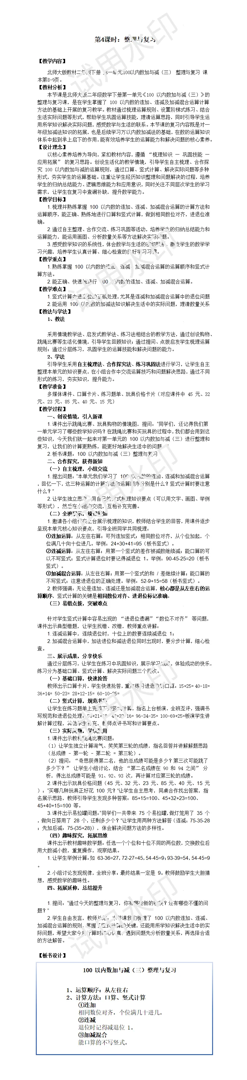 在完成北师大版二年级下册数学第一单元《100 以内数的加与减(三)》的整理与复习教学后,我进行了全面且深入的反思。