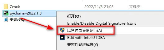2.选中pycharm-2022.1.3,鼠标右击选择“以管理员身份运行”
